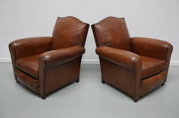 Fauteuil club à oreilles en cuir couleur cognac vintage hollandais