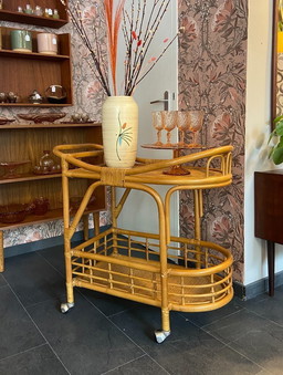 1960 - Magnifique et élégant chariot de bar en bambou et rotin par Franco Albini, fabriqué en Italie