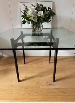 Tables design en verre Leolux en bon état. Les chaises ont été retapissées au début de l'année 2024.