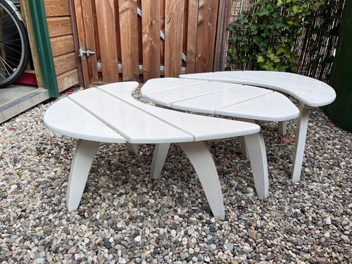 Ensemble original de 3 tables gigognes en teck avec surfaces colorées en Formica Mid Century Modern