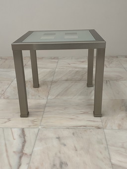 Table d'appoint en acier inoxydable avec plateau en verreTable d'appoint en acier inoxydable avec plateau en verre