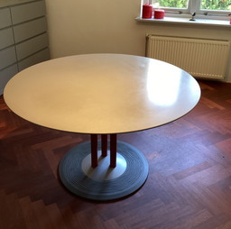 Table à rallonge Arco graphic avec plateau en bois et pieds en aluminium.