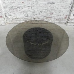 Table vintage Chippendale en verre trempé fumé avec plateau en noyer