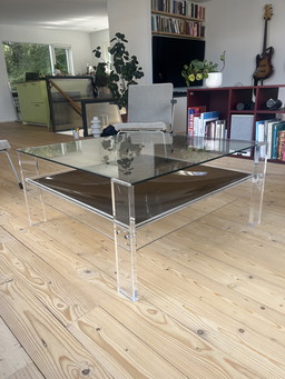Table de salon carrée vintage en plexiglas acrylique avec panneau en verreTable de salon carrée vintage en plexiglas acrylique avec panneau en verre