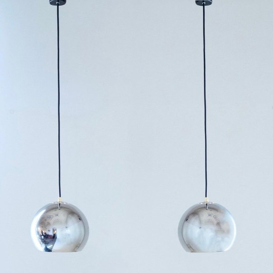Cette paire de suspensions « Œil », à la fois exquise et élégante, a été conçue par Goffredo Reggiani pour son entreprise familiale dans les années 1970. Ces lampes incarnent l'esthétique italienne audacieuse et futuriste du milieu du XXe siècle et de l'ère spatiale.