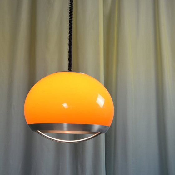 Cette suspension iconique, inspirée de l'ère spatiale et conçue par Vrieland pour Dijkstra, dégage un charme rétro-futuriste. Avec sa forme de globe orange saisissante et ses accents argentés, elle attire tous les regards. Fabriquée en aluminium et en plastique, elle est à la fois résistante et légère. Le câblage d'origine est intact et conforme aux normes européennes, facilitant ainsi son installation. Apportez une touche seventies à votre intérieur avec cette lampe design unique.