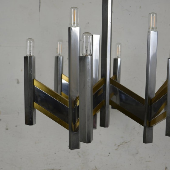 Cette suspension Sciolari, dessinée par Gaetano Sciolari et produite par Boulanger, incarne le raffinement des années 70. Avec ses lignes épurées et l'alliance du chrome et du laiton, elle apporte une touche de glamour rétro à toute pièce. Le câblage d'origine est intact et compatible avec les normes européennes. Idéale pour les amateurs de design vintage en quête d'une pièce maîtresse.