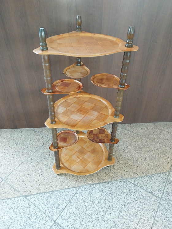 Cette charmante étagère en bois des années 1970 présente un design à plusieurs niveaux, idéal pour exposer des objets décoratifs. Fabriquée en bois, elle présente une finition marron chaud avec un motif à carreaux sur les étagères. Son attrait vintage en fait un complément idéal à tout décor rétro ou moderne du milieu du siècle. 3 étagères avec 6 petits objets décoratifs, 92 cm de hauteur, 43 cm de largeur de porte.