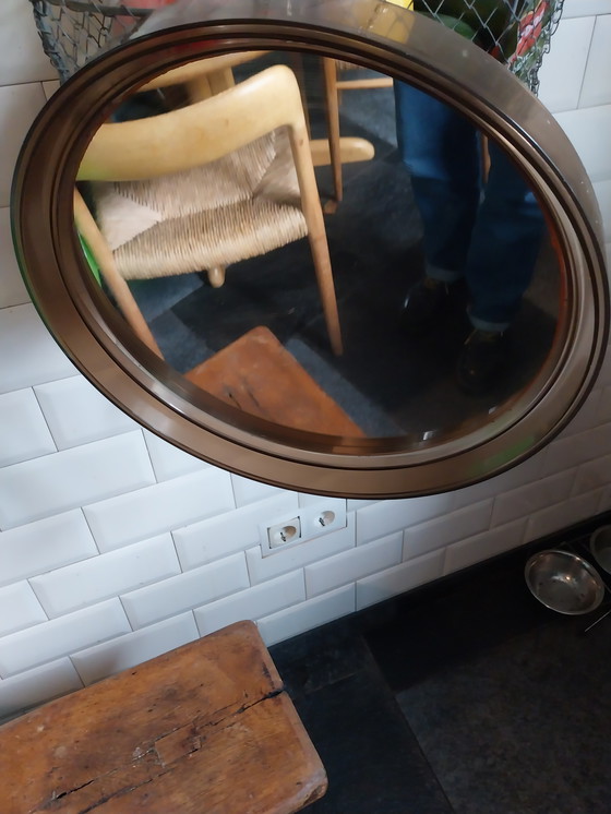 Ce miroir français Mid Century Modern des années 1960 présente un élégant bord fumé transparent. Le design est typique de l'époque et ajoute une touche de charme vintage à n'importe quelle pièce. Fabriqué en verre de haute qualité, ce miroir est un merveilleux exemple du style de l'époque. 40 cm de diamètre 5 cm d'épaisseur