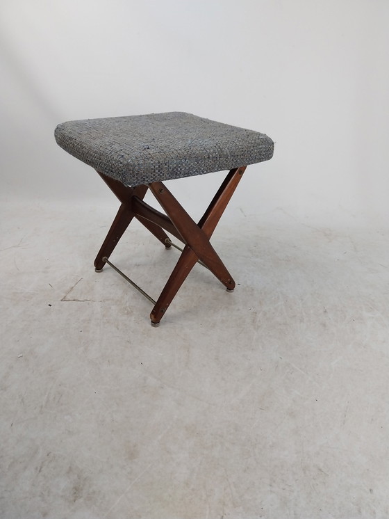 1 x Gimson and Slater ottoman 1960's Probablement reupholstered in solid blue fabric. Ce pouf est disponible en 2 hauteurs en inclinant la base. 30cm et 40cm. Le plateau mesure 40 x 40cm. En très bon état.