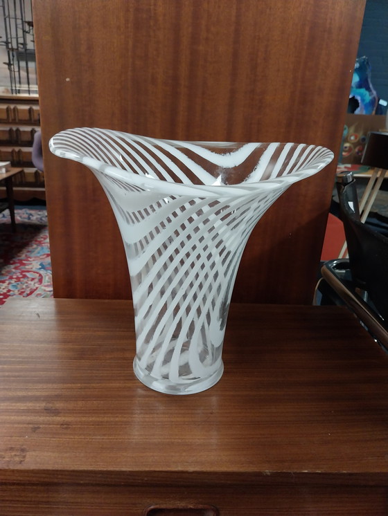 Ce magnifique vase à tourbillons de Peill et Putzler, datant des années 1980, est un exemple stupéfiant de la verrerie de cette époque. Le vase présente un élégant motif tourbillonnant en verre blanc et transparent, ce qui lui confère un effet dynamique et élégant. Il est parfait pour présenter des fleurs ou comme pièce décorative autonome dans votre intérieur. 26 cm de haut 26 cm de diamètre