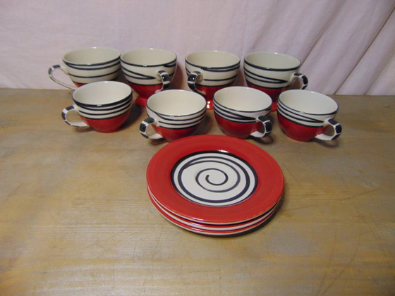 4 Tasses à café 4 Tasses à thé 3 soucoupes 1 soucoupe manquante Malheureusement. Marque : Solid England Handpaintted Stoneware (R) Sont en très bon état. Année : Circa 2005/2007 Est dans une maison sans fumée Est emballé dans du plastique à bulles !
