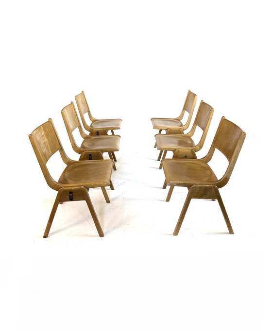 Magnifique ensemble de 6 chaises de salle à manger en hêtre contreplaqué. Modèle pratique, empilable et interchangeable. Belle structure en bois courbée, joli design organique. Les sièges en contreplaqué sont encore en très bon état, sans aucun dommage. La solidité allemande à son meilleur. Un modèle populaire. 18 disponibles.