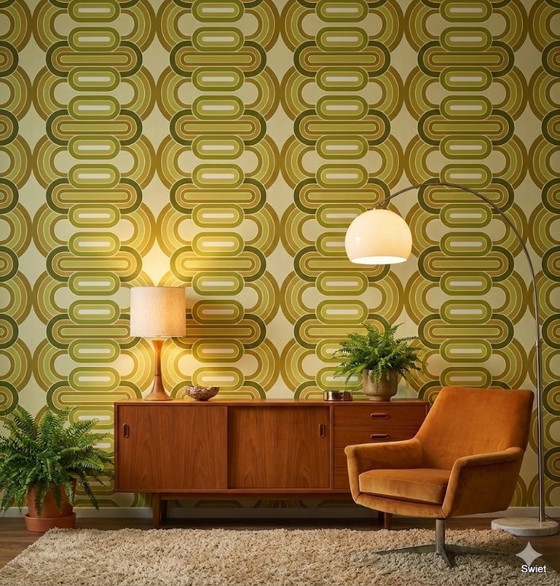 Papier peint original des années 70 à motifs ovales dans des tons moutarde, olive et beige. Un design audacieux et rythmé, idéal pour une cuisine vintage ou un mur d'accent.