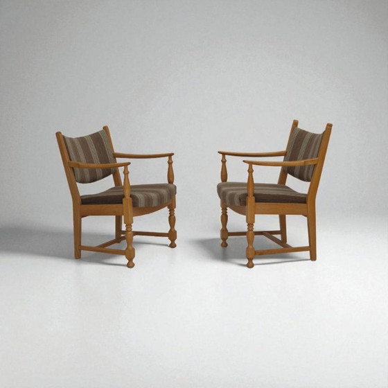 1970, paire de fauteuils scandinaves. Meuble d'origine en laine beige rayée, bois de chêne massif. Très bon état d'origine : pas d'odeurs, pas de taches et construction stable. Fabriqué par un fabricant de meubles norvégien dans les années 1965-70. Design vintage scandinave original en provenance directe du Danemark. Les chaises ont été vérifiées par un artisan.