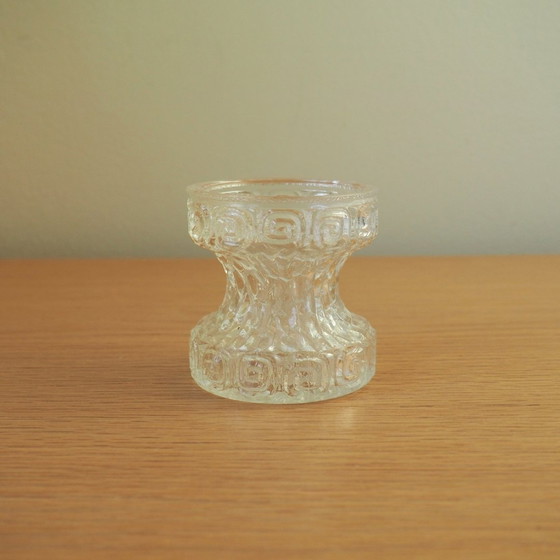 Vase en verre pressé "carnaval" texturé des années 1970 avec un motif grec, conçu par Stolzle Oberglas en Autriche. Fabricant : Stolzle Oberglas Stolzle Oberglas Origine : Autriche Autriche Caractéristiques : hauteur 7,5 cm x diamètre 7 cm x poids 150 grammes Epoque : 1970