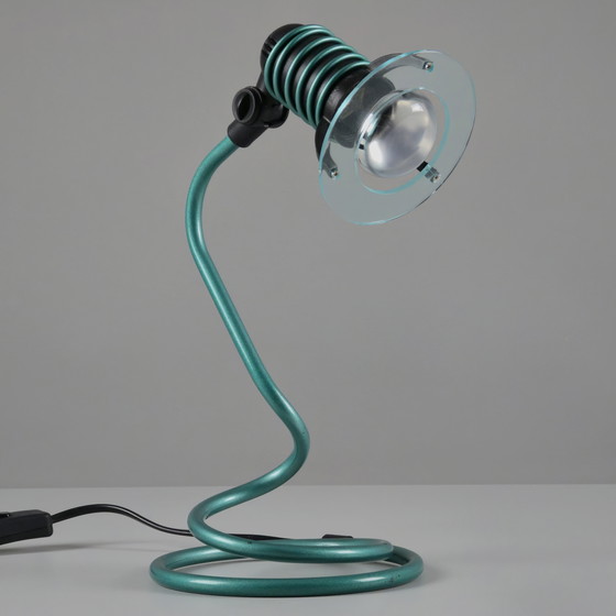 Lampe de bureau ajustable postmoderne des années 1990 avec une base en spirale turquoise métallique vibrante avec une forme sculpturale en forme de serpent par ESTO.