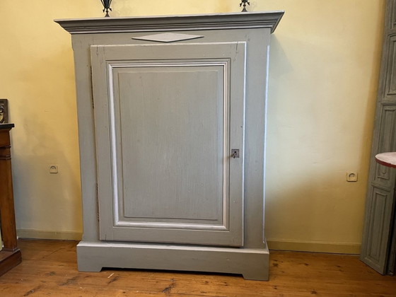 Ravissante armoire de France datant de la moitié du 19e siècle. 1850-1870. Le meuble est peu profond et possède deux larges étagères derrière la grande porte. La porte, avec ses belles charnières anciennes, repose sur le dessus de l'armoire, ce qui lui donne un bel aspect. Au-dessus de la porte, l'armoire est décorée d'un wybert. La serrure d'origine est livrée avec une clé. Hauteur : 134,5 cm. Largeur du dessus : 111,5 cm. Largeur du coffre : 100,5 cm. Profondeur du capot : 39 cm. Profondeur de la coque : 33,5 cm. Profondeur des étagères : 29,5 cm. La paroi arrière a été remplacée, c'était nécessaire.
