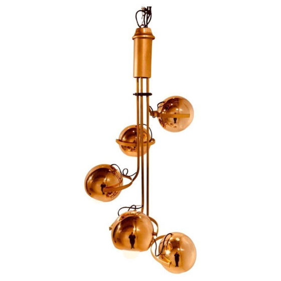 Le lustre Space Age chromé doré des années 1960, conçu par l'estimé designer italien Goffredo Reggiani, illustre l'esthétique audacieuse et futuriste de l'époque. Le lustre comporte cinq points lumineux réglables, chacun doté d'un intérieur blanc qui rehausse la luminosité des ampoules et crée une douce lueur d'ambiance. La finition chromée dorée ajoute une touche de glamour, complétant parfaitement le design épuré et moderne de la lampe.
