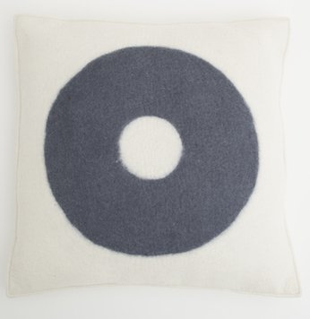 Nouveau/non utilisé. Coussin design M&Otto Design de 70x70 cm. Le devant du coussin est en laine épaisse feutrée à la main, de couleur blanc laine, avec des motifs de cercles de couleur bleu/gris. Le dos du coussin est en tissu de laine blanc. Le coussin est vendu avec un rembourrage en PET recyclé et un coutil en coton. Ce type de coussin a été vendu par Flamant et Linteloo, entre autres.