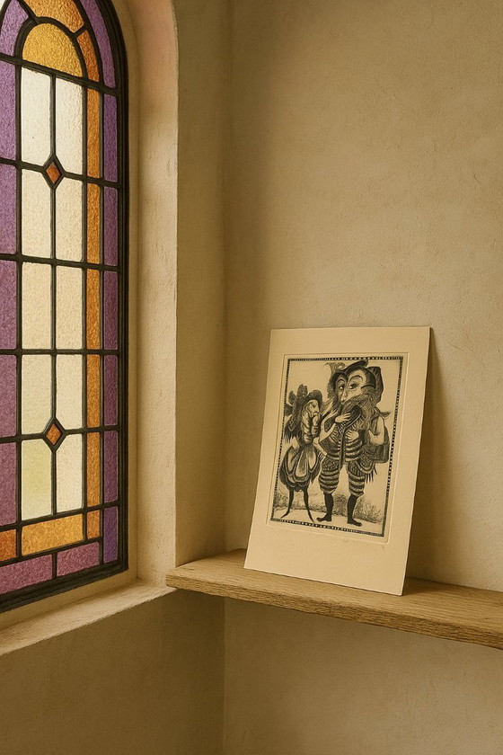 Design : La gravure représente deux personnages intrigants et caricaturaux dans un style très détaillé et contrasté. Il s'agit d'une œuvre intemporelle qui attire l'attention.
