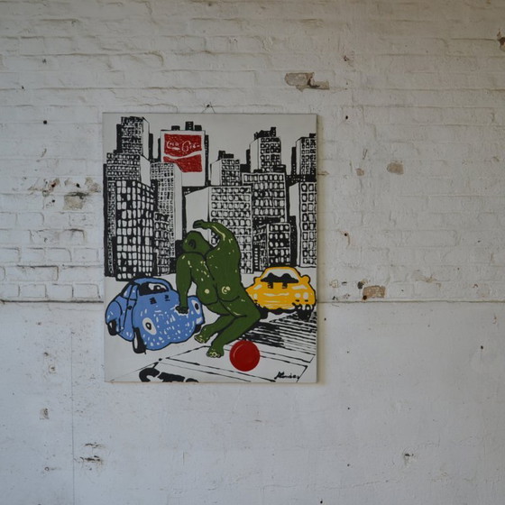 Cette saisissante fresque de King Kong apporte une touche ludique et colorée à n'importe quelle pièce. Imprimée sur toile, l'œuvre représente un paysage urbain vibrant, dominé par une silhouette verte emblématique qui captive le regard.