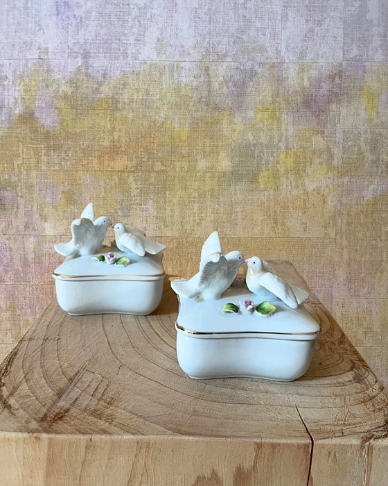 Charmant ensemble de deux petites boîtes à bijoux en porcelaine blanche, délicatement décorées de deux colombes et de petites fleurs en relief.