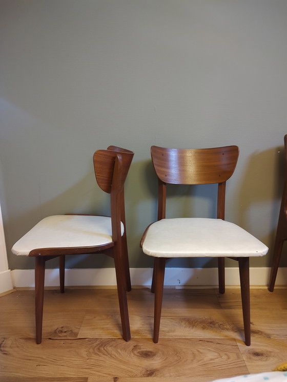 Cet ensemble de deux chaises Mid Century des années 1960 constitue une merveilleuse addition à tout intérieur. Fabriquées en bois de teck, elles exsudent l'élégance distinctive du style moderne Mid Century. Les chaises sont recouvertes d'un confortable revêtement blanc qui contraste magnifiquement avec la chaleur du bois. Elles sont parfaites pour la salle à manger ou comme chaises d'appoint dans le salon.