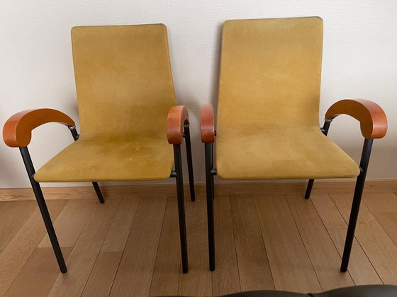 Deux chaises vintage, modèle Pigalle, du designer italien Pierangelo Caramia. Revêtement en daim ocre/jaune, poignées en bois et structure en métal. Bon état vintage. Légères traces d'usure sur le tissu (voir photo). Prix demandé : 195 euros pour les deux chaises.