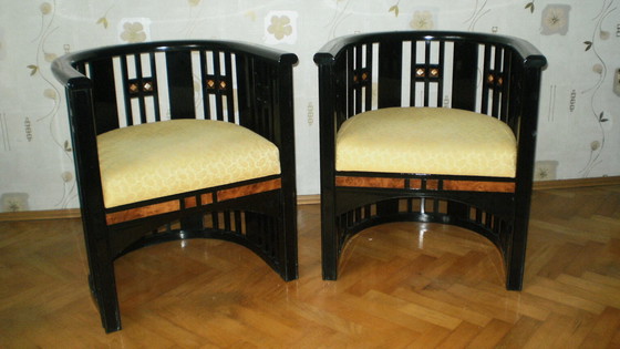 Deux fauteuils de style Josef Hoffmann en bois de hêtre, laqués en noir piano. Construction stable, traces d'utilisation visibles correspondant à l'âge.