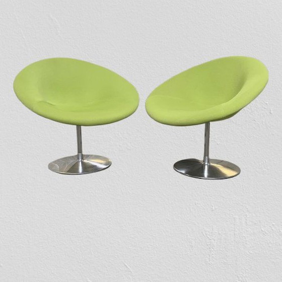 2 'petits' fauteuils pivotants Globe de Pierre Paulin pour Artifort Le F427 est le parfait mélange de pop art et de style rétro et le petit frère du Globe d'Artifort. L'assise est en bois et recouverte d'un tissu vert citron. L'assise est soutenue par un pied en acier et une base ronde en aluminium chromé. La forme unique de la coque offre un confort d'assise optimal. 82 cm de largeur, 83 cm de profondeur, 77 cm de hauteur. Hauteur d'assise 42 cm Design hollandais des années 1960 Légers signes d'utilisation