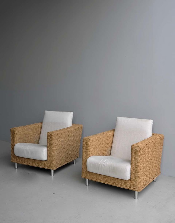 Paire de fauteuils en corde tressée française, modèle « Wicky », signés Didier Gomez pour Ligne Roset France, années 1990. Dimensions du fauteuil sans coussins : hauteur 62 cm, largeur 78 cm, profondeur 85 cm. Dimensions avec coussins : hauteur 81 cm, largeur 78 cm, profondeur 85 cm, hauteur d’assise 39 cm. Didier Gomez est designer depuis 1978 (année de lancement de ses premières collections de mobilier) et architecte d’intérieur depuis 1985. Il conçoit aussi bien du mobilier que des espaces (boutiques, grands magasins, appartements, résidences privées, sièges sociaux) à travers le monde. Parmi ses clients : Yves Saint-Laurent, Pierre Bergé, Jean-Paul Gaultier, le Carrousel du Louvre, LVMH, Bernard Arnault, Céline, Louis Vuitton, Galeries Lafayette, Vivendi Universal, Kenzo, Christian Dior, Pomelato, De Beers, L’Oréal, BNP Paribas, Bouygues Telecom, Le Méridien.