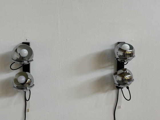 Illuminez votre espace avec une touche d'élégance rétro-futuriste grâce à ces appliques vintage Raak de l'ère spatiale. Leur design iconique en forme de globe oculaire et leur finition chromée capturent l'essence de l'esthétique moderne du milieu du siècle, ce qui en fait un complément parfait à tout intérieur élégant.