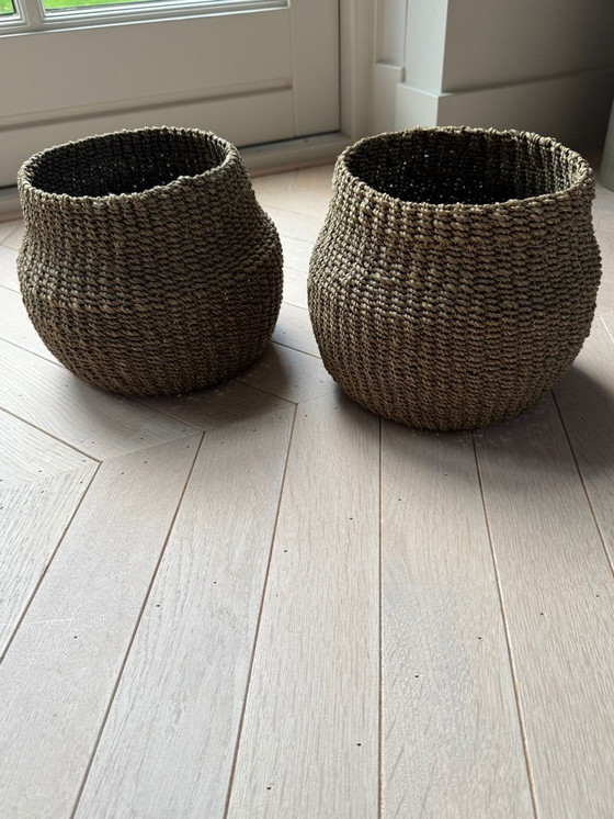 Ensemble de deux paniers à plantes en sisal tressé. Ils sont en parfait état, comme neufs. Couleur vert olive/mousse, en forme de pot. À utiliser avec un gobelet en plastique à l'intérieur (pour éviter les fuites d'eau). Achetés chez un fleuriste réputé. Solides et très résistants.