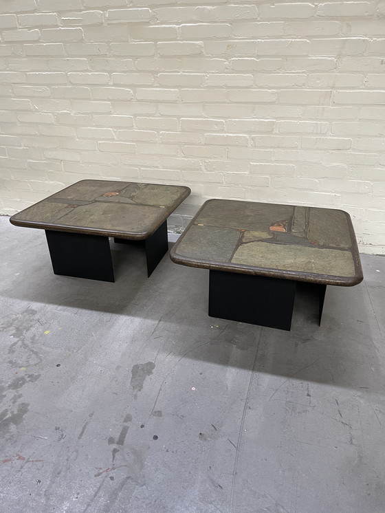 Découvrez une paire de magnifiques tables d'appoint en pierre naturelle, conçues par le célèbre Paul Kingma. Véritables témoins de l'art moderne, ces tables allient la beauté brute de la pierre à des bases métalliques épurées, créant un contraste visuel saisissant qui sublimera tout espace de vie.