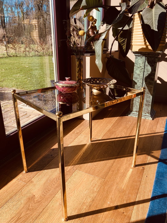 En laiton avec plateau en verre fumé.