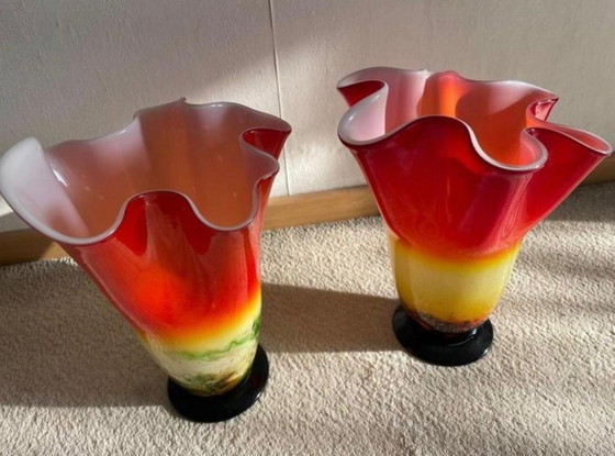 Apportez une touche de couleur vibrante à votre intérieur avec ces superbes vases de Murano. Parfaits pour illuminer n'importe quelle pièce, ces vases arborent un mélange envoûtant de teintes rouges, jaunes et vertes qui dansent sur le verre. Leurs bords ondulés uniques et leurs couleurs éclatantes en font une pièce maîtresse pour tout décor.
