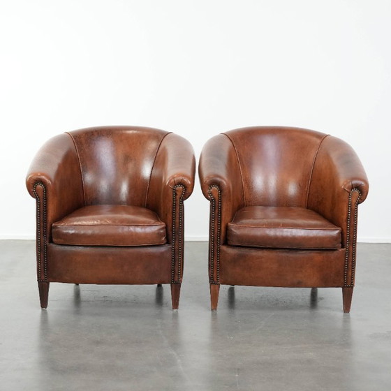 Grâce à sa forme et à sa finition, cet ensemble de deux fauteuils club en peau de mouton offre un style intemporel et plein de charme. Ils s'intègrent facilement dans tous les intérieurs et conviennent parfaitement à un usage domestique, au bureau ou dans un établissement hôtelier. Dotés d'un coussin d'assise amovible, ils offrent une assise confortable et adaptée. Des années d'utilisation soigneuse leur ont laissé des traces d'usure normales, qui contribuent à leur aspect vintage chaleureux. Structurellement, ils sont en bon état et prêts à l'emploi. Où les installerez-vous ?