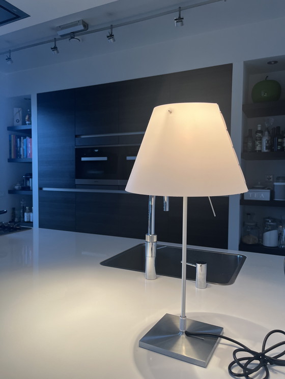 Hauteur 51 cm, largeur 25 cm. Illuminez votre espace avec l'élégance raffinée des lampes de table Luceplan Constanza. Ces lampes apportent une touche sophistiquée à toute pièce, alliant design moderne et charme intemporel. Le pied argenté épuré et l'abat-jour blanc classique créent un équilibre harmonieux, les rendant compatibles avec les intérieurs contemporains et traditionnels.
