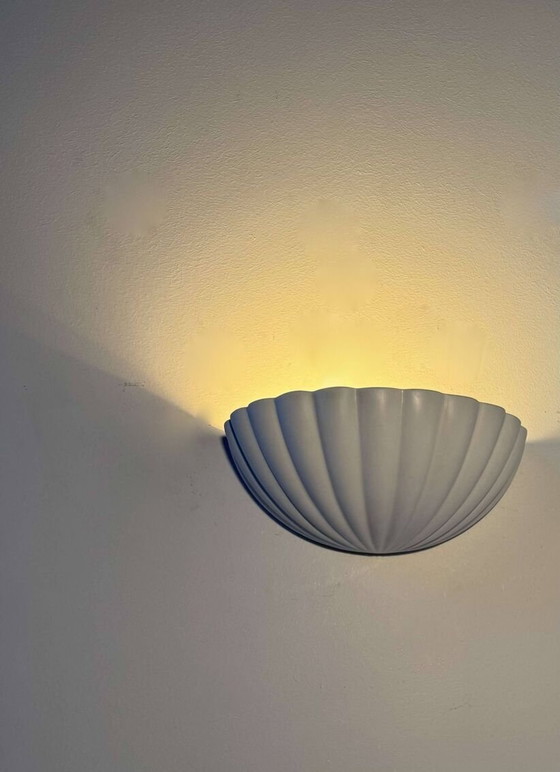 Paire d'appliques coquillage en platre blanc mat produite en france dans les années 70. Design intemporel, éclairage indirect, avec jeux de lumière par la fente inférieure. Ampoule e27, led compatible, prête à poser. Une deuxième paire est disponible.