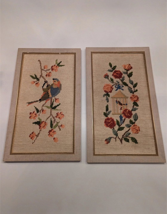 Images romantiques vintage à l'aiguille d'oiseaux et de fleurs avec toile et cadre doré.