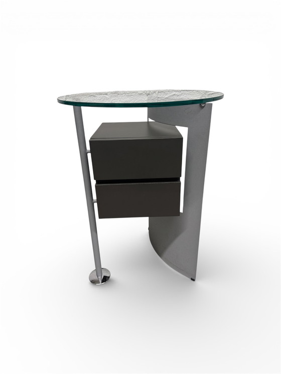 Plongez dans l'univers de l'élégance postmoderne avec cette paire de tables d'appoint Casprini Klee, conçues par le célèbre duo néerlandais Kuin & Kuin. Créées dans les années 1990, ces tables témoignent d'un design innovant et d'une fonctionnalité remarquable, offrant un mélange unique de matériaux et de style qui sublimera tout intérieur contemporain.