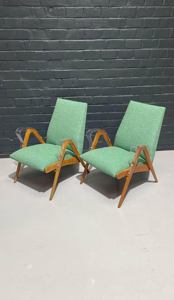 Ces fauteuils vintage de Tatra Nabytok présentent un design frappant avec un revêtement textile vert et un cadre en bois robuste. Les accoudoirs en plexiglas ajoutent une touche de modernité au style vintage classique. Parfaits pour ajouter une touche rétro à tout espace de vie, ces fauteuils sont à la fois élégants et confortables.
