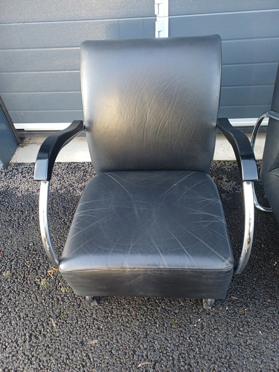 Découvrez cet élégant ensemble de deux fauteuils Dikkert van Dykmeyer en cuir noir, parfait pour tout intérieur moderne. Ces fauteuils allient confort et design épuré, idéaux pour la maison comme pour le bureau.