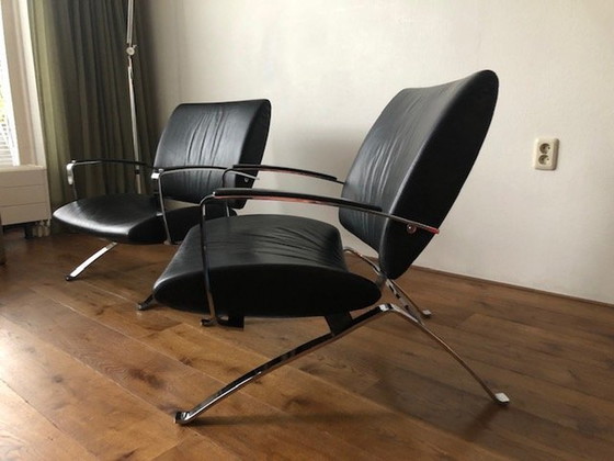 Deux fauteuils Artifort gracieux et élégants. Le modèle Dodo a été conçu par Rene van Holten. Les fauteuils ont une base et des accoudoirs chromés et sont recouverts d'un cuir de qualité. Finition : revêtement en cuir Elmosoft couleur 99999 noir.