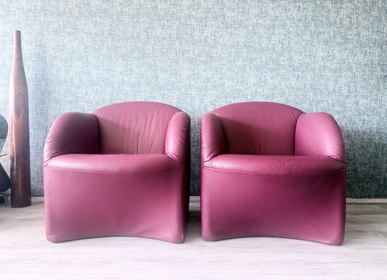 Une paire de fauteuils Ben d'Artifort, une pièce remarquable et rare, signée Pierre Paulin. Ce modèle se distingue par ses volumes architecturaux doux, son dossier arrondi et sa forme enveloppante évoquant une baignoire, le tout revêtu d'un cuir bordeaux profond.