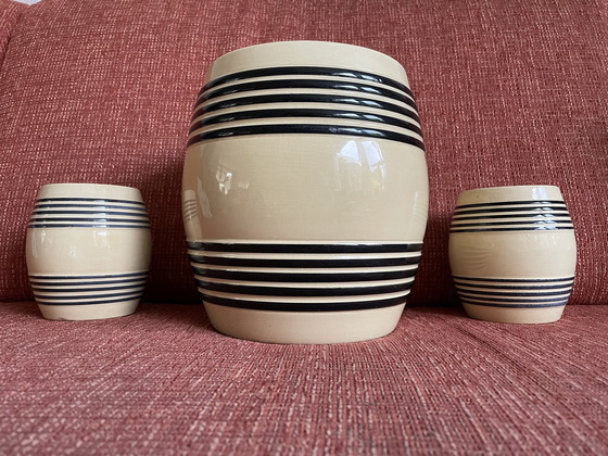 Trois jarres anciennes (vers 1910) en grès ferrugineux, jaune et noir/bleu, Petrus Regout & Co., Maastricht.