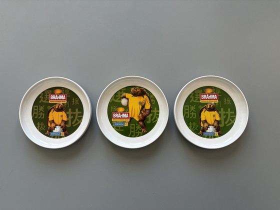 Trois affiches publicitaires pour la bière BRAHMA, éditées en 2002 pour commémorer la Coupe du monde au Japon et en Corée du Sud, où le Brésil a remporté son cinquième titre mondial. Idéales pour les collectionneurs d'objets de football. Diamètre : 15 cm.