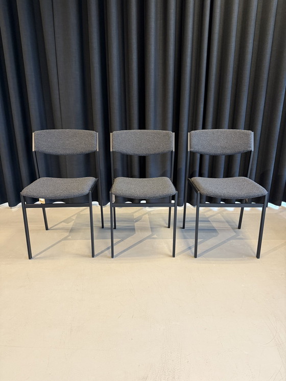 3x chaise de salle à manger no. 50 sans accoudoirs utilisée dans notre salle d'exposition. Pour le reste, les chaises sont comme neuves. Structure = revêtement poudre RAL9005 Jet Black Tissu = Alpine Onyx 169 (bouclé) Ce modèle est une réintroduction du célèbre designer néerlandais Gijs van der Sluis.