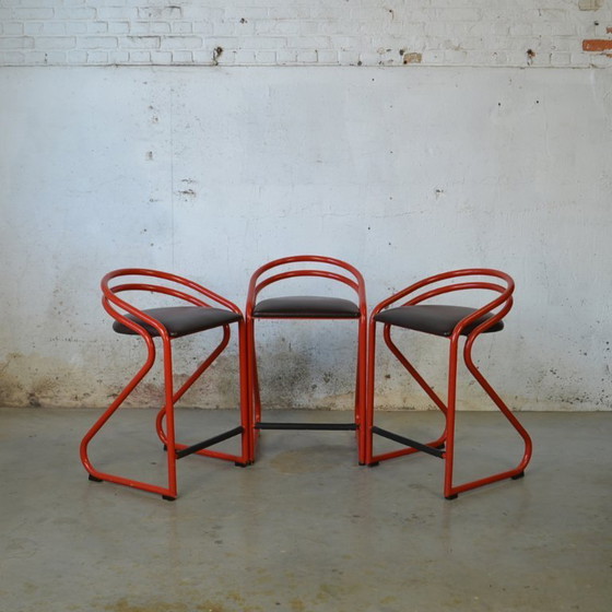 Ensemble de trois tabourets tubulaires vintage des années 1980. Ces tabourets allient une structure métallique robuste à une assise confortable en similicuir. Leurs couleurs rouge et marron éclatantes leur confèrent un style rétro qui s'intègre parfaitement dans un intérieur industriel ou moderne.